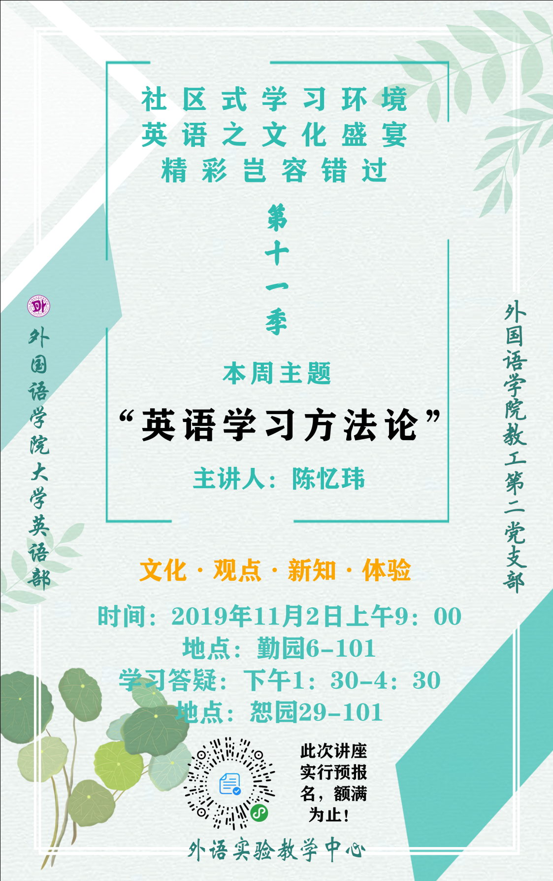 在吃瓜黑料 教工第二党支部的引领下,结合大学英语教学改革的实际,“不忘初心 牢记使命”,为在校学生营造良好的社区式英语学习氛围,从而提升学生的英语学习水平,扩大学生的视野,支部所属的大学英语教学部为全校学生开设的周末英语专题讲座活动目前已经进入了第十一季第三期。