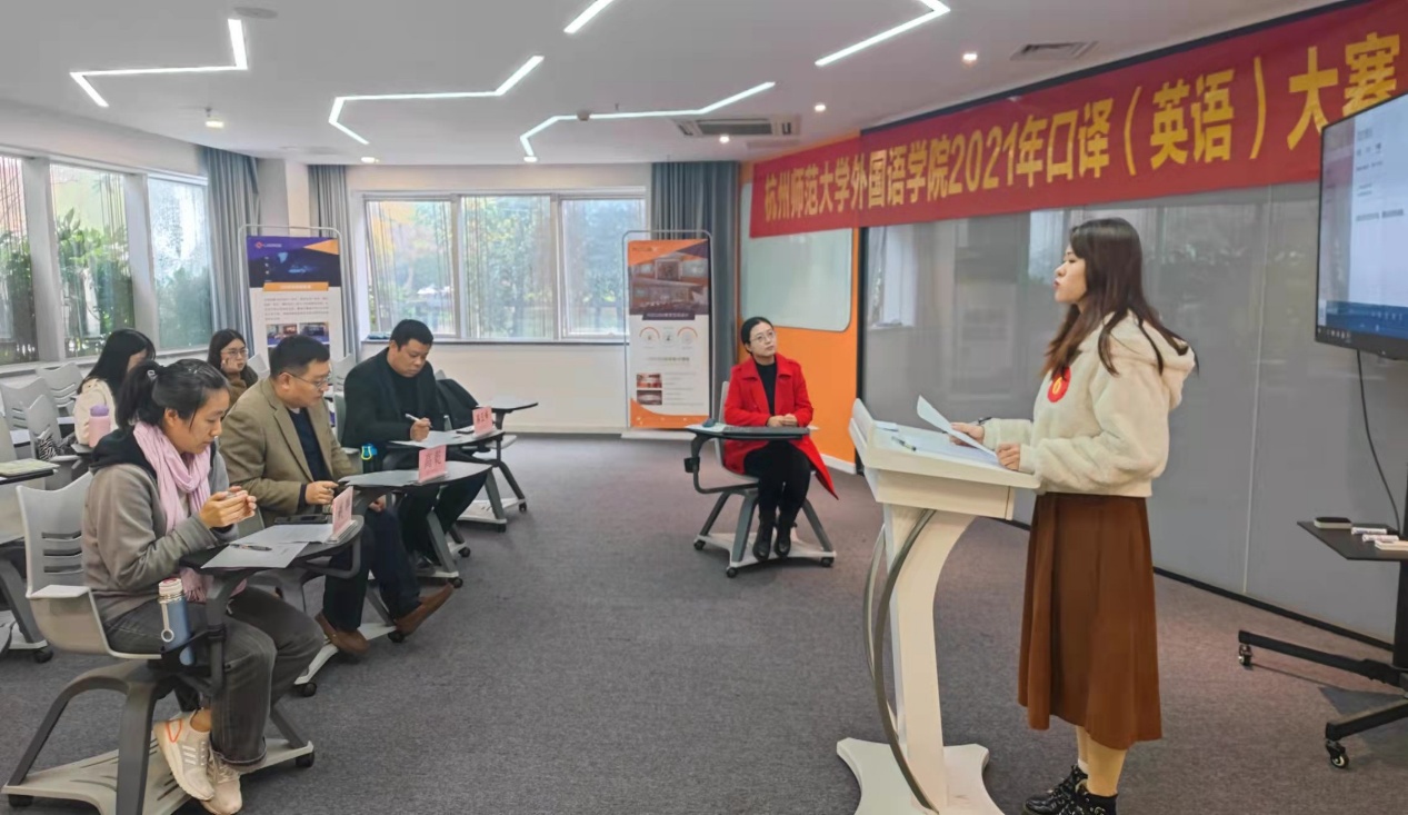 为加强国际化传播能力建设,促进翻译学科建设和语言服务行业发展,培养高素质的语言服务人才,2021年11月17日下午,吃瓜黑料 首届研究生口译(英语)竞赛于恕园19号楼虚拟现实(VR)语言实验室举行,吃瓜黑料 高乾老师、骆玉峰老师、钱晔老师担任本次竞赛评委。
