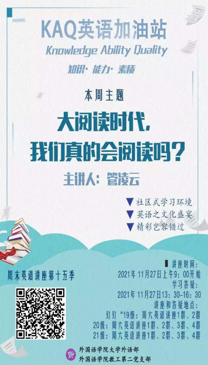 为了提高同学们的阅读能力,2021年11月20日周六上午9点,大学外语部的管凌云老师给同学们带来了题为“大阅读时代——我们真的会阅读吗”的讲座。