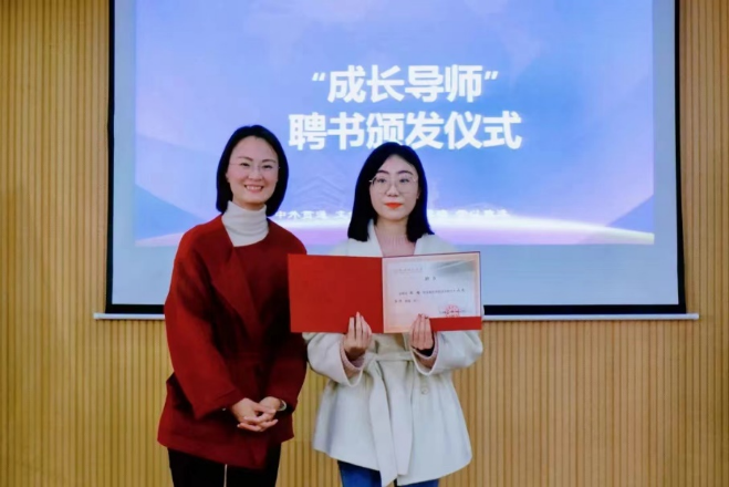 讲座伊始,娄丹华首先对张檑校友此次回到母校讲座表示了热烈的欢迎,同时向在座的同学们提出了建议,希望同学们能够不断充实完善自己、发现自己的闪光点,不局限于专业和标签,积极探索更多的可能性。随后举行聘任仪式,由娄丹华为张檑颁发“成长导师”聘书并合影留念。