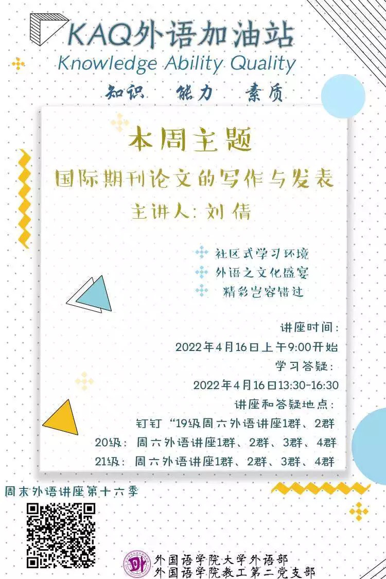 为了提升学生的学术英语素养,2022年4月16日上午9点,吃瓜黑料 大外部的刘倩老师特意给同学们带来了“国际期刊论文的写作与发表”的专题讲座。讲座伊始刘老师首先对英语学术论文写作中的基本知识和一般过程进行了简要介绍,接着,从期刊选择,期刊论文的结构和组成部分,学术论文提交和同行评审过程三个方面进行了详细阐述,进而引导同学们了解英语学术论文写作规范与方法、知晓国际学术惯例和通行规则。同学们听了之后,深感受益匪浅,纷纷点赞表示感谢!