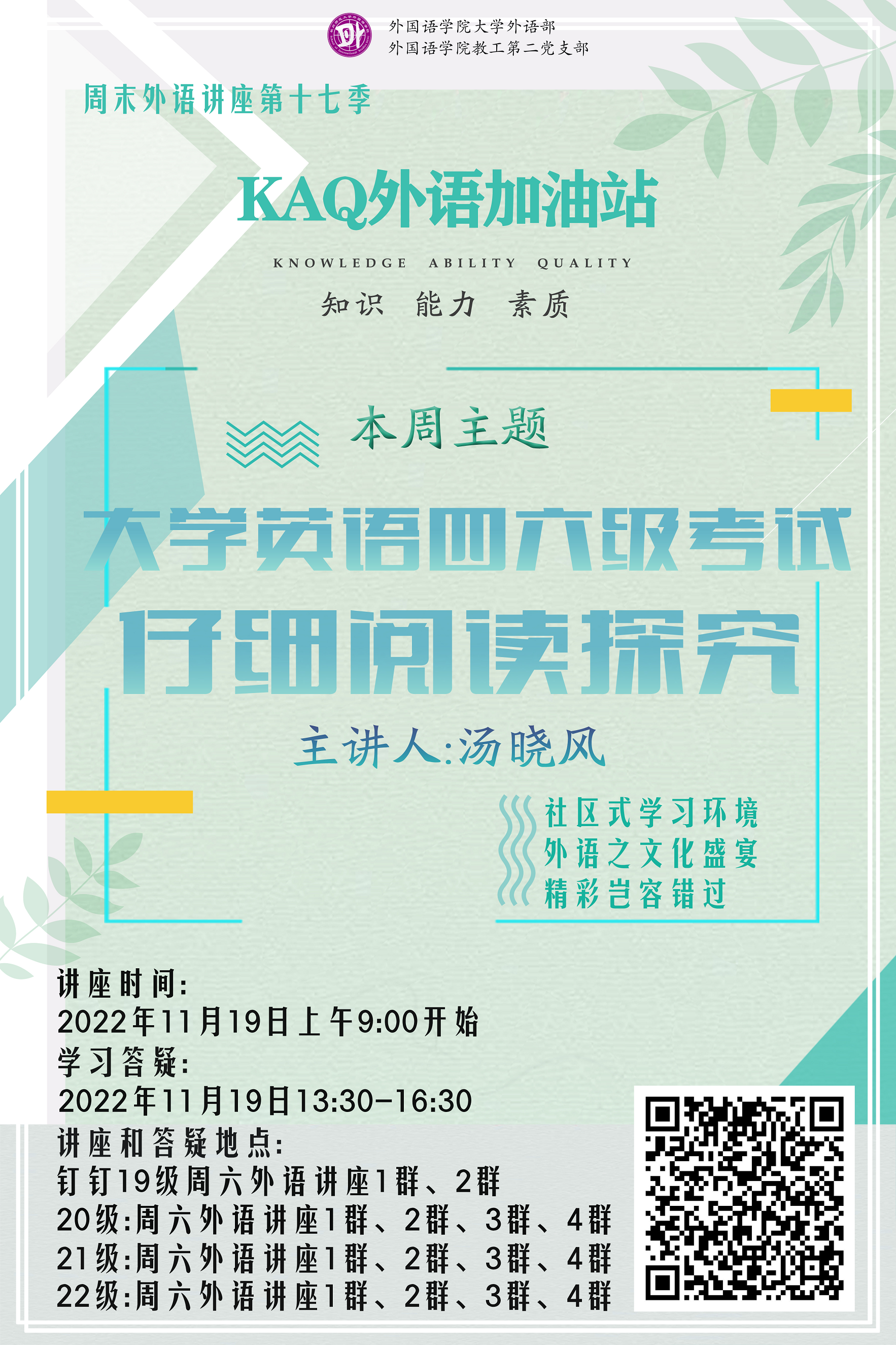 为了满足师大学生在外语能力上“一精多会”和“一专多能”的需求,“周六外语公益讲座——‘KAQ(知识、能力、素质)外语加油站’”,秉持一贯的SIM(student-centered, Innovative,Multilingual)理念,坚持“以生为本、不断创新、多语种国际视野”。考虑到学生对于英语文学知识等方面的广泛兴趣,在大学英语四六级考试即将来临之际,特邀请大外部的汤晓风老师为同学们带来了题为“大学英语等级考试仔细阅读探究”的讲座。讲座于2022年11月19日上午进行,通过14个钉钉群进行线上联播。