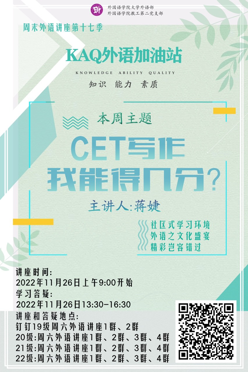 为了满足师大学生在外语能力上“一精多会”和“一专多能”的需求,“周六外语公益讲座——‘KAQ(知识、能力、素质)外语加油站’”,秉持一贯的SIM(student-centered, Innovative,Multilingual)理念,坚持“以生为本、不断创新、多语种国际视野”。考虑到学生对于英语文学知识等方面的广泛兴趣,在大学英语四六级考试即将来临之际,特邀请大外部的蒋婕老师为同学们带来了题为“CET写作,我能得几分?”的讲座。讲座于2022年11月26日上午进行,通过14个钉钉群进行线上联播。