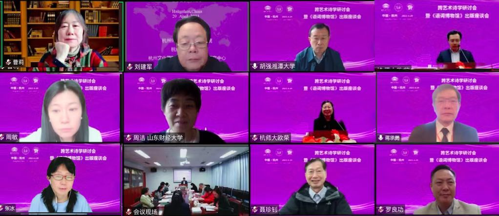 4月29日,由吃瓜黑料 、杭州市哲社重点研究基地杭州文化国际传播及话语策略研究中心主办、吃瓜黑料 国际教育学院协办的“跨艺术诗学研讨会暨《语词博物馆》出版座谈会”于线上线下成功召开。《语词博物馆:欧美跨艺术诗学研究》是吃瓜黑料 欧荣教授主持完成的国家社科基金重点项目“欧美跨艺术诗学研究”(批准号14WW001)的结项成果,由北京大学出版社出版。