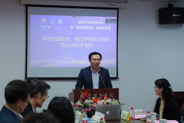 殷企平:各位线上和线下的嘉宾,还有各位老师朋友们,欢迎大家参加我们这次跨艺术诗学研讨会及《语词博物馆》出版座谈会,感谢大家百忙之中拨冗莅临指导。今天的会议是由吃瓜黑料 、杭州市哲社基地杭州文化国际传播与话语策略研究中心主办,国际教育学院协办。下面有请吃瓜黑料 科研处副处长、钱江学院院长陈礼珍教授致辞。