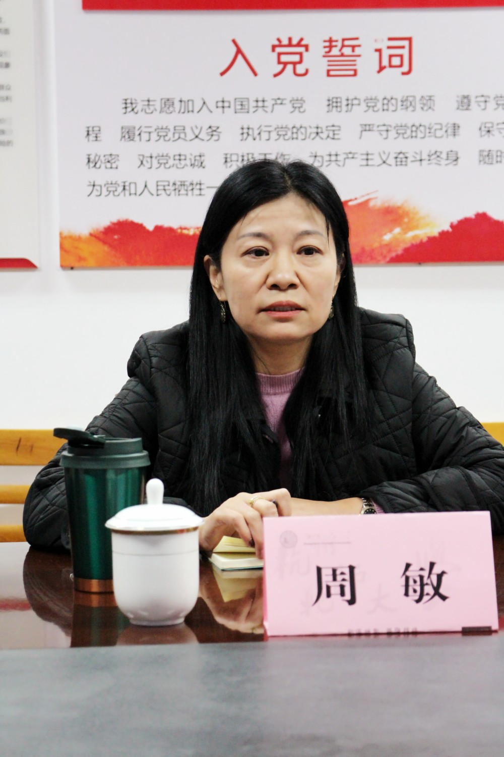 周敏代表学院领导班子感谢学校党委长期以来对学院事业发展的倾力指导与全力支持。她表示,坚决拥护学校党委的决定,新班子将发扬精诚团结、分工协作的优良作风,锚定学校争创“双一流”目标任务不懈努力奋斗。