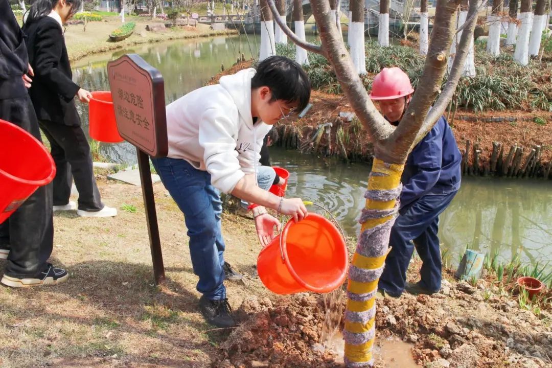 活动中,老师与同学们共同协作,并肩而立一一把稳树干、覆土施肥、筑基围坝、剪枝浇水,清新的泥土上洒满了粉色的樱花瓣。在这片宁静的校园角落,师生们心手相连,共同打造和谐美丽的生态校园。