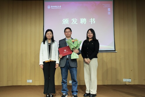 随后,周敏院长为每位指导教师颁发聘书,青年教师向师父献花致谢。