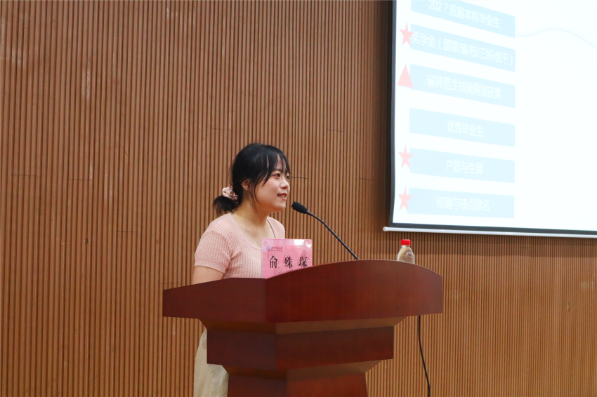第二个部分是“学长学姐考编谈”,俞殊琛学姐为大家分享了她在考编竞争中的心得体会。她为同学们提供了一些招聘信息发布的渠道,并强调了信息获取的重要性。针对教招考试,俞殊琛学姐从报考条件,考试内容,前期准备,笔试面试准备等多个方面进行讲解。最后,她鼓励同学们在面对就业形势时保持积极的心态和坚定的信念。