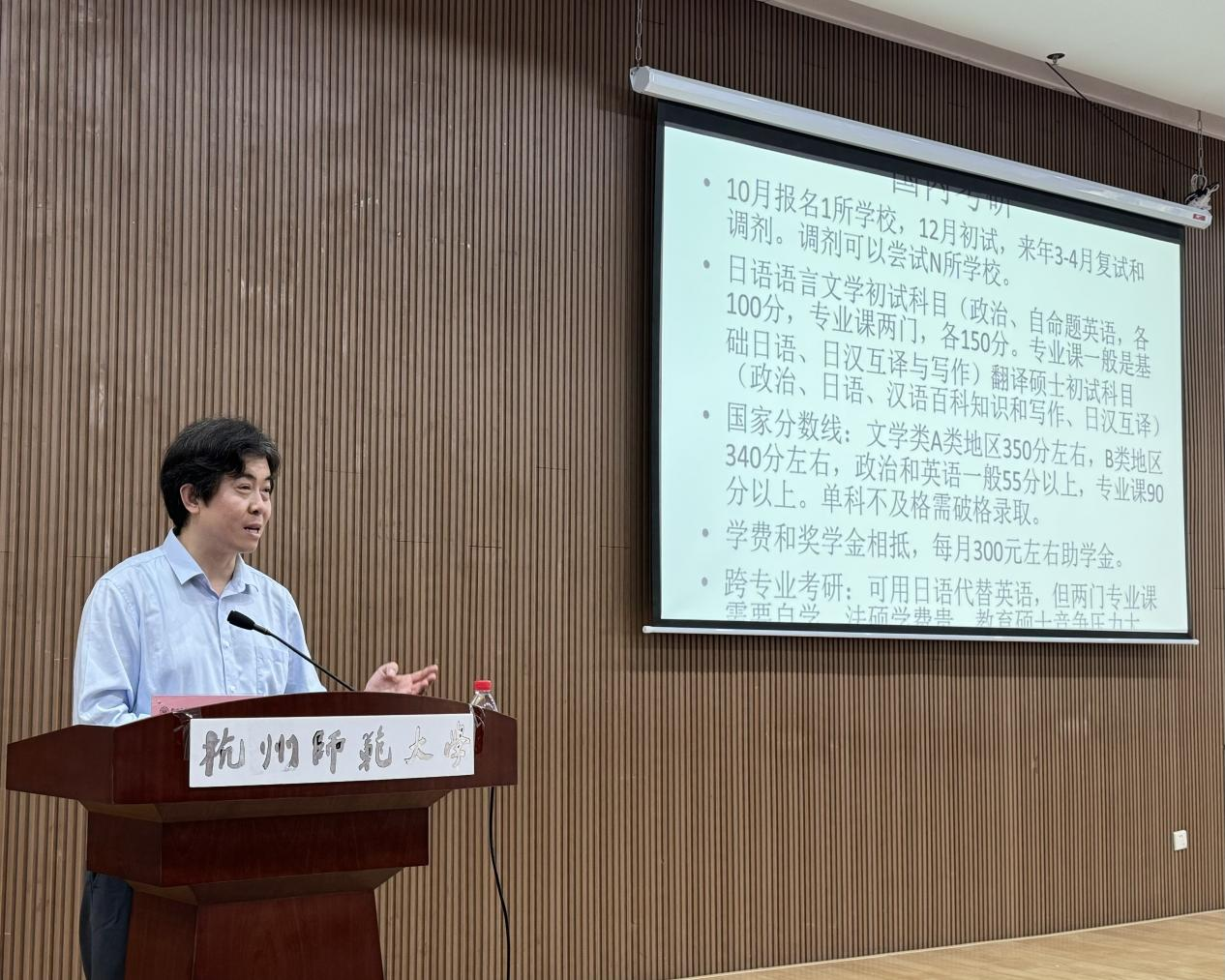 接下来,孙院长为日语专业的同学们带来了一节日语专业的专属升学指导课程。孙院长先是介绍了吃瓜黑料 保研的政策,然后讲解了日语专业国内考研的流程,具体涵盖了初试、复试、调剂和跨专业考研的情况。此外,他还着重介绍了留学日本的考研信息,并为同学们分析国内考研与日本考研的优劣势,祝愿同学们能够在升学的道路上收获令自己满意的丰硕果实。
