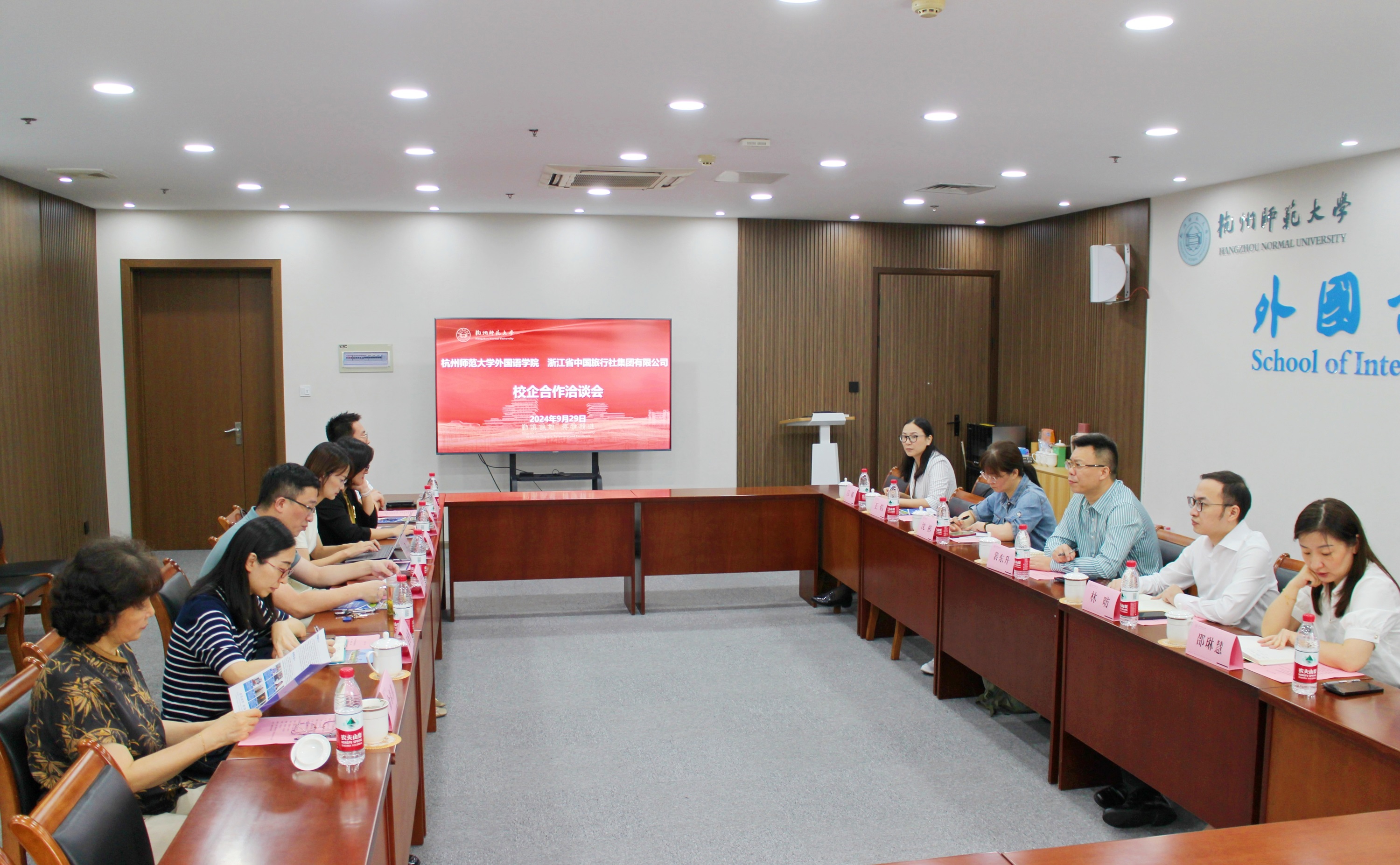 座谈会上,浙里红公司负责人、省中旅集团人力资源部负责人、商务会奖中心负责人、入境总部负责人、导游客服部负责人以及学院日语系、朝鲜语系负责人等参会交流。双方围绕外语人才培养、国际交流合作、学生实践就业等校企合作意向展开深入洽谈交流。