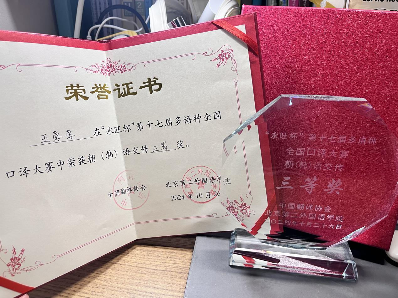 10月26日,第十七届“永旺杯”多语种全国口译大赛在北京落下帷幕。吃瓜黑料 2022级朝鲜语口译专业研究生王蓉蓉斩获“永旺杯”第十七届多语种全国口译大赛中朝(韩)语交传组三等奖。