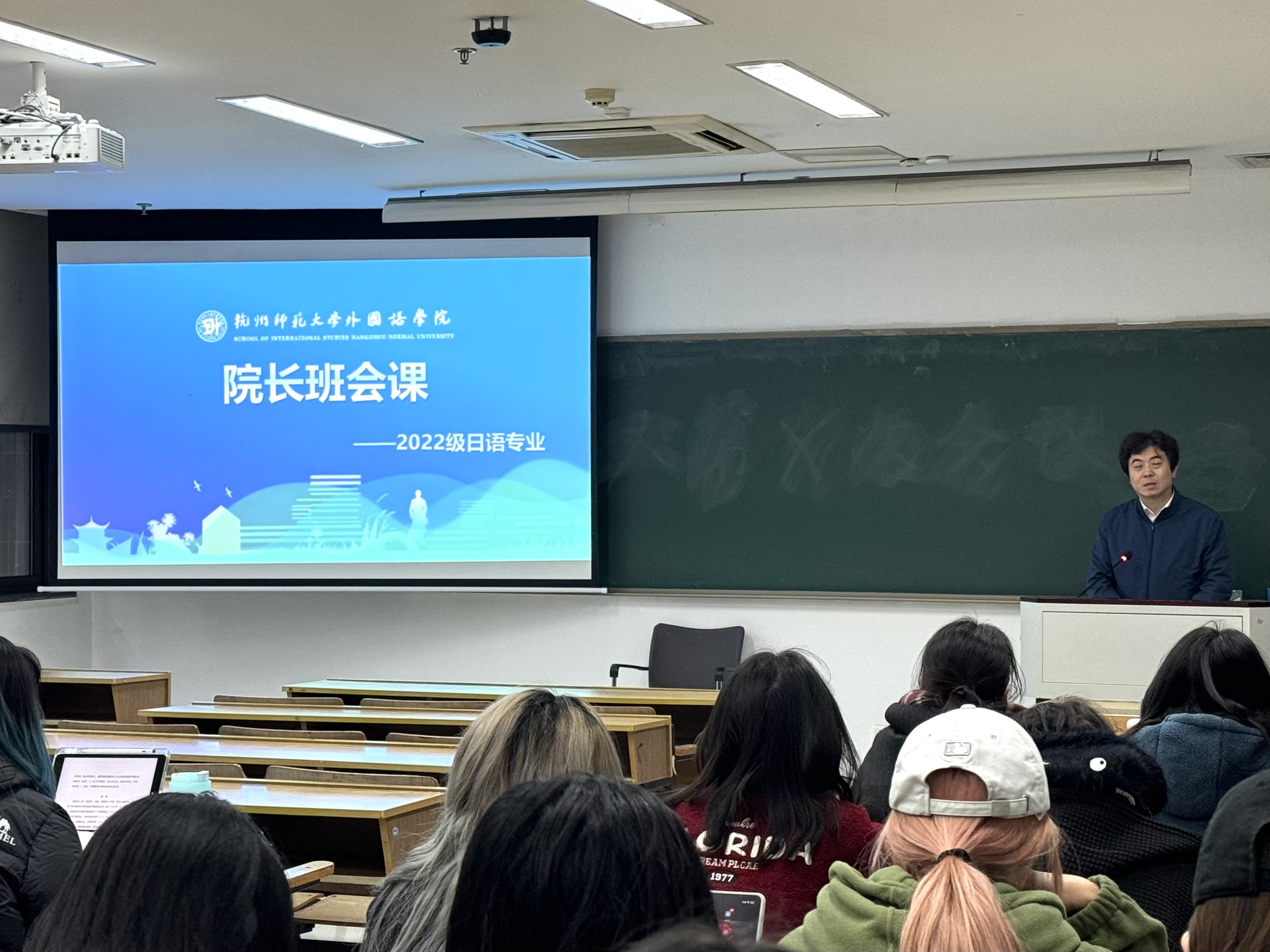 2024年11月27日下午,在杭师大仓前校区恕园11号楼107,学院副院长孙立春教授为2022级日语专业学生带来了一堂极具指导意义的院长班会课,聚焦于同学们最为关心的考研、出国、就业这三个方面,展开了全方位、深层次的介绍与分析,为即将步入大四的同学们答疑解惑、指引方向。
