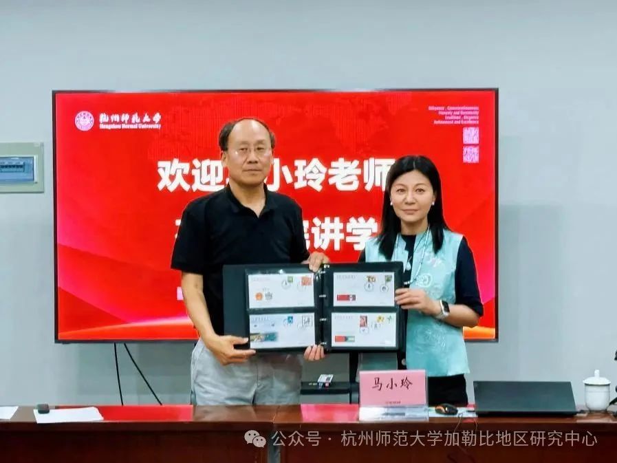 讲座现场气氛热烈,在随后的互动交流环节,马小玲先生就中心发展、学术定位与外交文化研究等议题,与在场师生深入探讨,并提出了多项具有前瞻性与可操作性的建设性建议。讲座结束前,马小玲先生向加勒比地区研究中心捐赠了一套珍贵的外交特种封收藏套装,内含11个加勒比国家的定制外交封。周敏主任代表加勒比地区研究中心向马小玲先生致以诚挚谢意,她指出,这份礼赠是对中心工作的肯定与支持,具有很高的象征意义与学术价值。