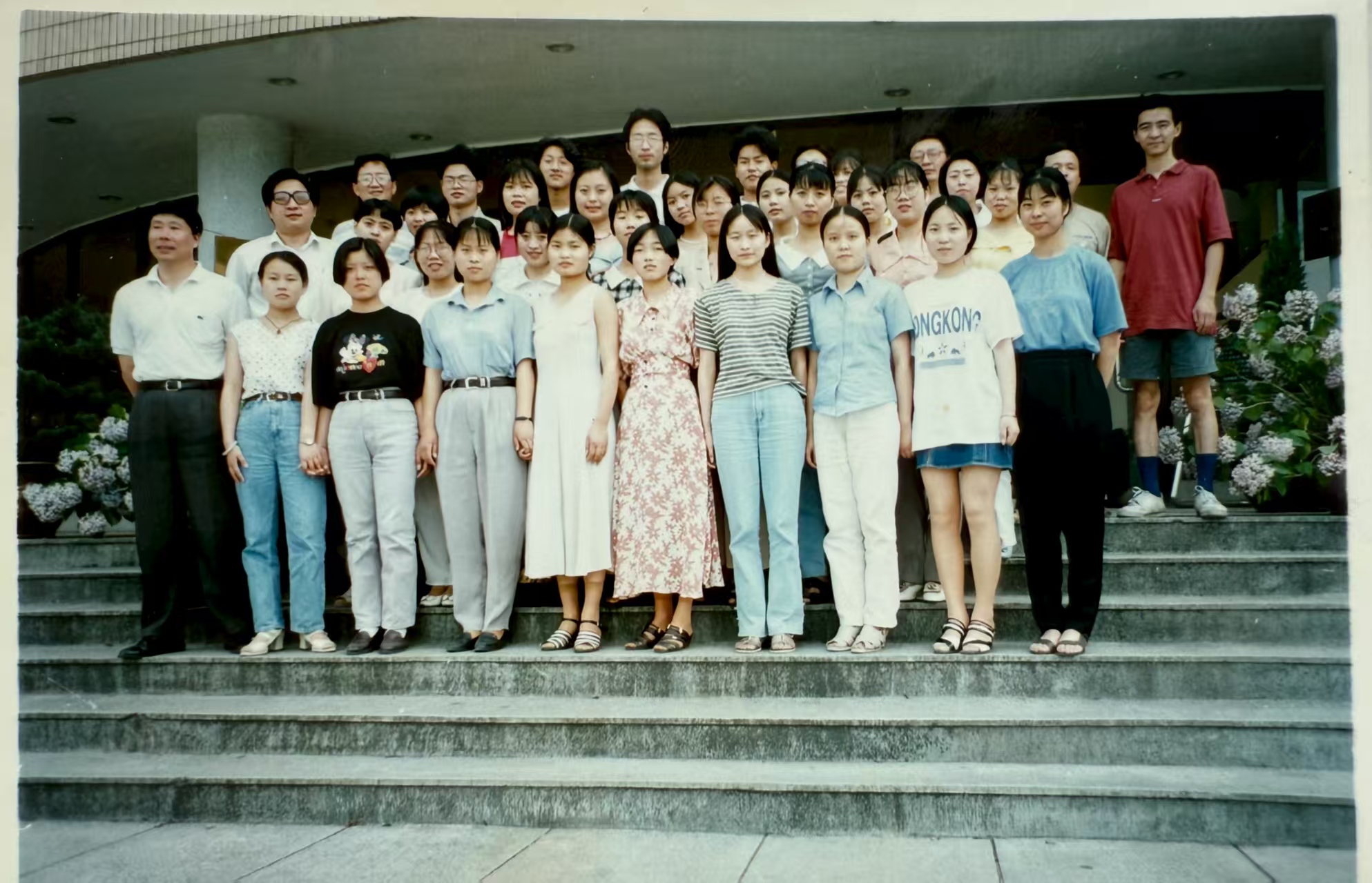 暮色渐浓,外语学院前的石阶成了最温情的舞台。背景是灯火通明的现代教学楼,左侧垂柳依依,右侧绿树成荫,与三十年前的校园景象颇有几分神似。22位校友按照当年毕业照的站位分四排站定,手持“再聚首30年”的KT板,脸上洋溢着灿烂的笑容。