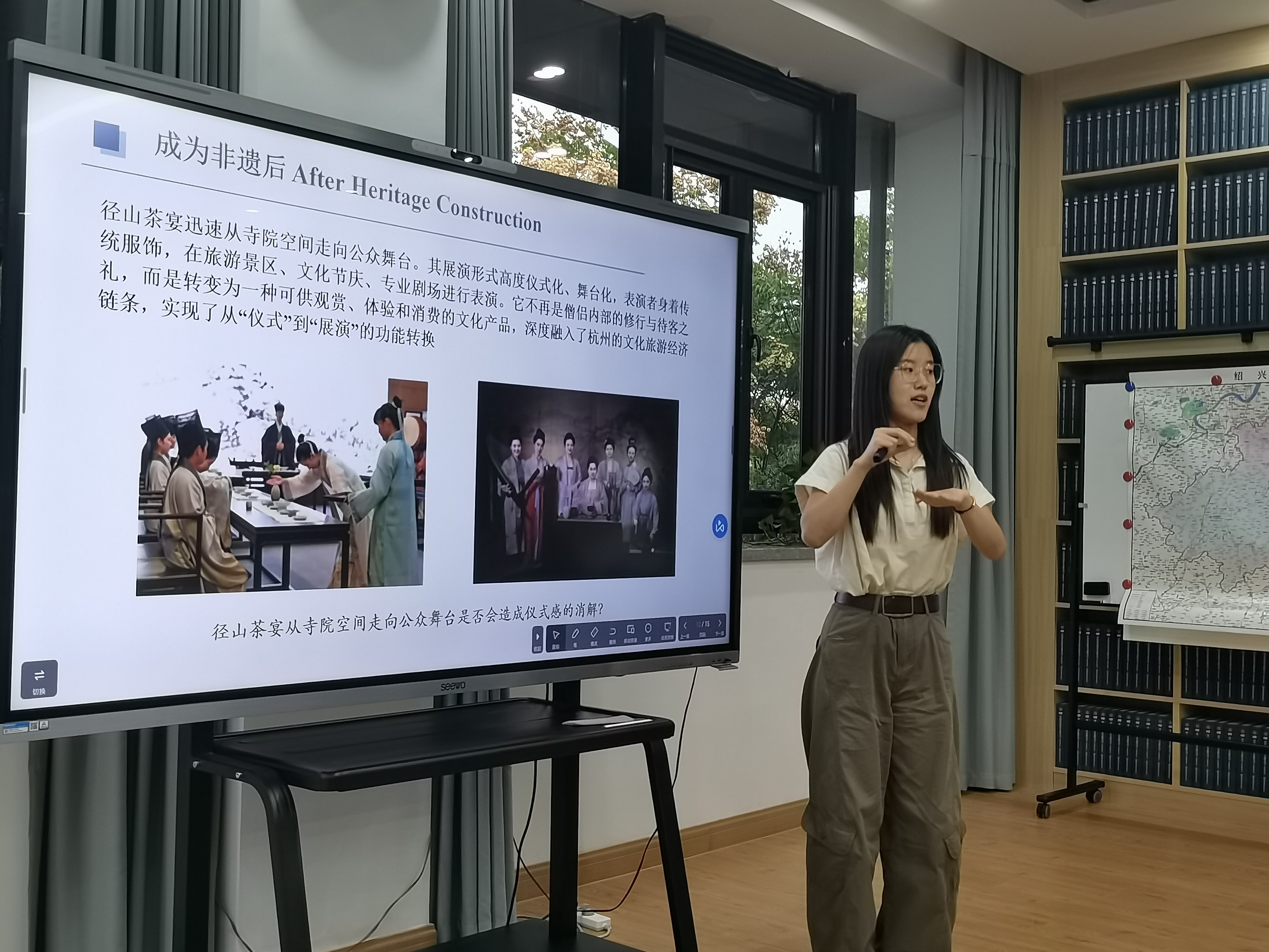 此外,马庆凯老师与李雨濛同学合作,以“佛教礼仪的遗产化建构:以杭州市径山茶宴为例”为题进行了发言。该研究从遗产化理论视角出发,深入剖析径山茶宴的礼仪内涵与当代价值,其研究视角新颖、论证充分,引发与会嘉宾广泛讨论与好评。