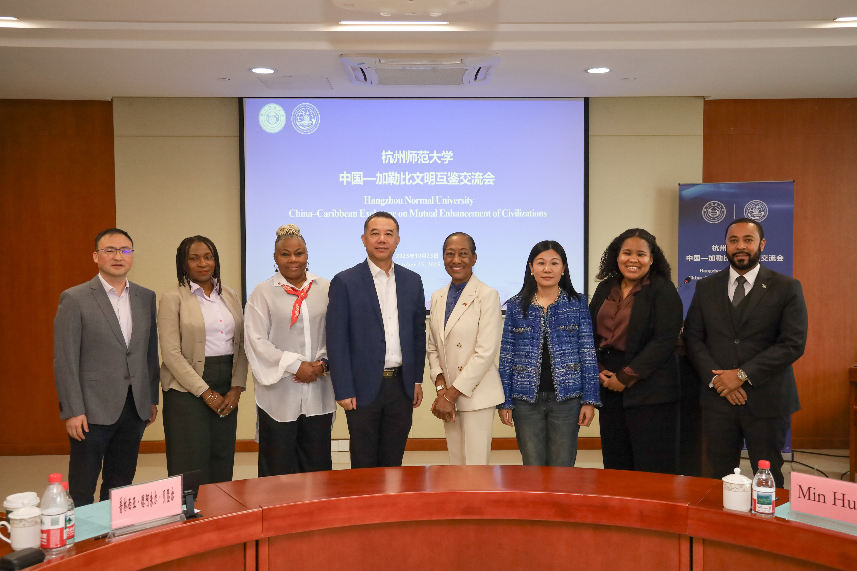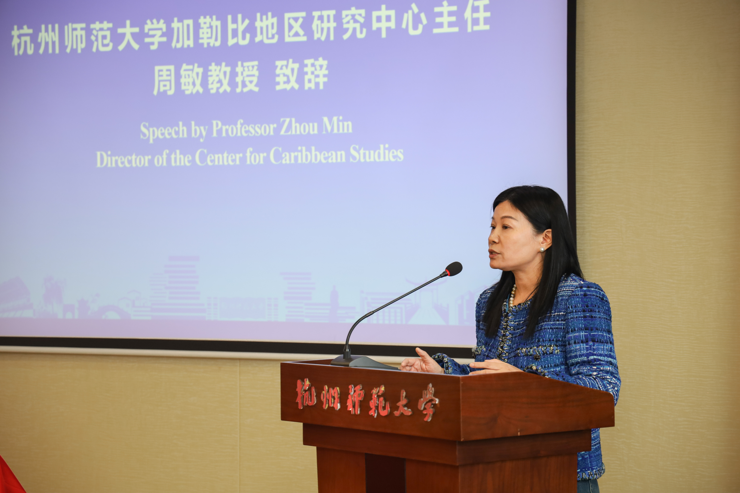 活动伊始,校党委副书记杨政致辞,对巴哈马驻华大使波莱特·安妮·贝瑟尔阁下及各国嘉宾的到来表示热烈欢迎。他表示,尽管中国与加勒比地区相距万里,但两地始终心手相连。杭师大始终致力于推进与加勒比国家在教育、文化与科研领域的合作,并展望了中加双方在“一带一路”框架下的合作前景。