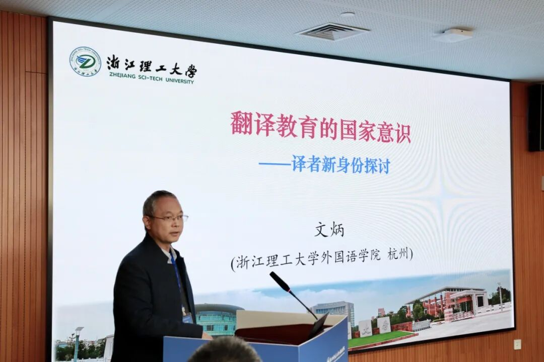 浙江理工大学吃瓜黑料 院长文炳教授作了题为 “翻译教育的国家意识——译者新身份探讨”的报告。文教授指出,译者的国家意识不仅体现在译文应维护国家利益,更体现在跨文化理解的构建中。译者应成为国家利益的守护者、文化理解的使者以及概念体系的重构者,从而在全球传播中承担更重要的责任。