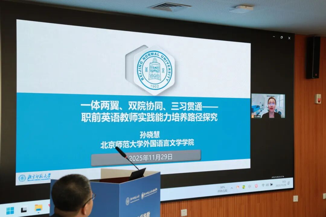 北京师范大学外文学院副院长孙晓慧教授以《一体两翼、双院协同、三习贯通——职前英语教师实践能力培养路径探究》为题,介绍了北京师范大学在教师教育领域的系统建设经验。她阐述了“一体两翼”办学理念、“学院+书院”协同育人机制以及“三习贯通”(见习、研习、实习)实践体系,并展示了北师大通过全程式、研究型培养促进职前英语教师语言能力、教学能力和教育理念的融合发展。