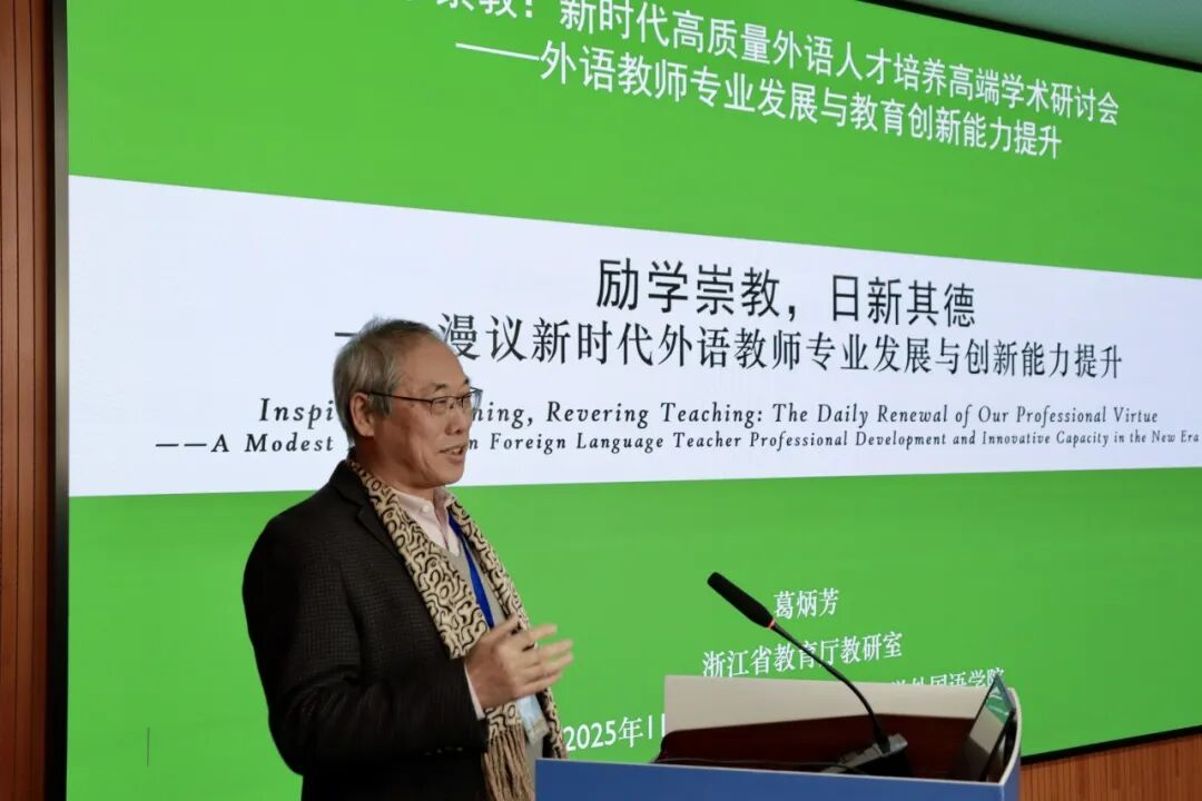 浙江省教育厅教研室葛炳芳教研员以“励学崇教,日新其德——新时代外语教师专业发展与创新能力提升”为题,借镜哈贝马斯“三种理性”理论,提出新时代教师发展应实现从“工具理性”向“实践理性”再到“解放理性”的提升。他强调,外语教师不仅要提升教学技能,更应涵养学理素养与探究精神,树立“学人型教师”理念,以实现自觉成长与教育使命的统一。