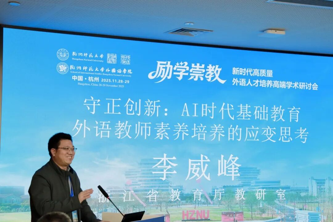浙江省教育厅教研室李威峰教研员作报告“守正抱新:AI时代基础教育外语教师素养培养的应变思考”。他指出,AI技术推动外语教学范式革新,未来教师应保持专业学科素养、教育教学素养等“守正”核心能力,同时强化数字技术素养、融合教学素养与伦理文化素养等“抱新”能力,以在“不变”中适应AI时代的深刻变革。